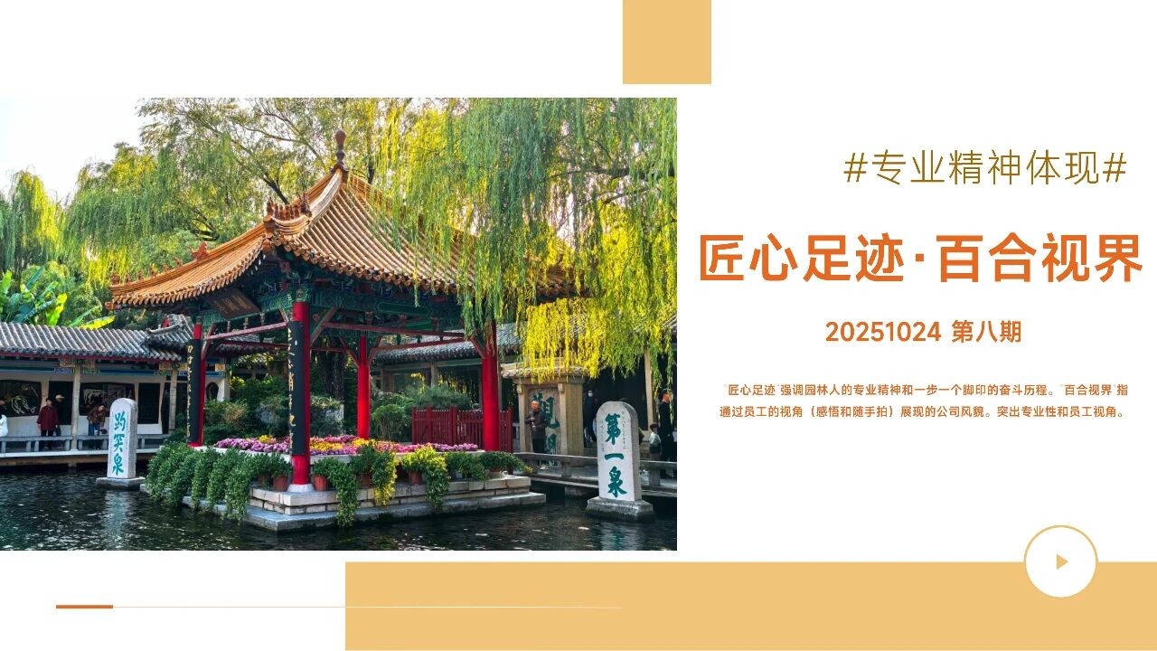 匠心足跡 強調園林人的專業(yè)精神和一步一個腳印的奮斗歷程。“百合視界“指通過員工的視角(感悟和隨手拍)展現的公司風貌。突出專業(yè)性和員工視角。