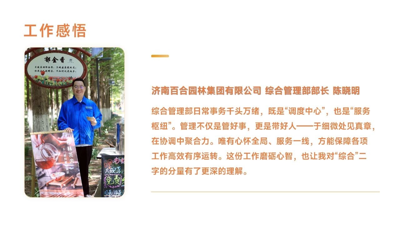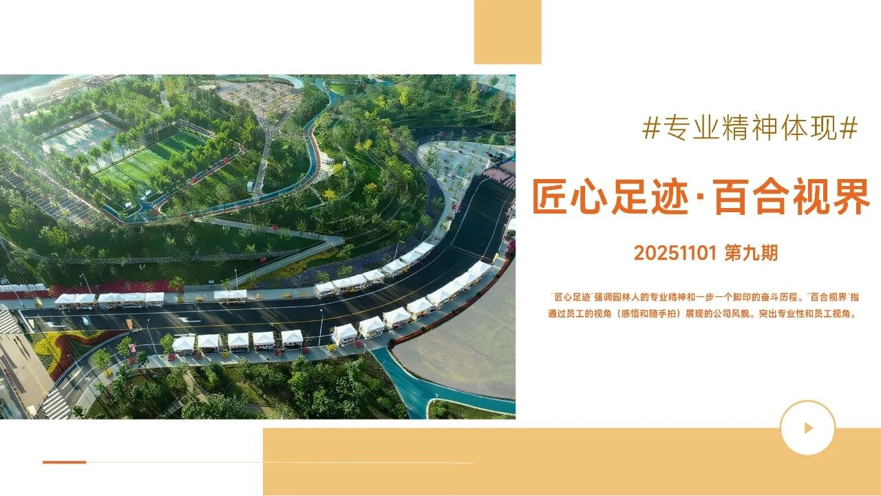 匠心足跡 強(qiáng)調(diào)園林人的專業(yè)精神和一步一個(gè)腳印的奮斗歷程。“百合視界“指通過(guò)員工的視角(感悟和隨手拍)展現(xiàn)的公司風(fēng)貌。突出專業(yè)性和員工視角。