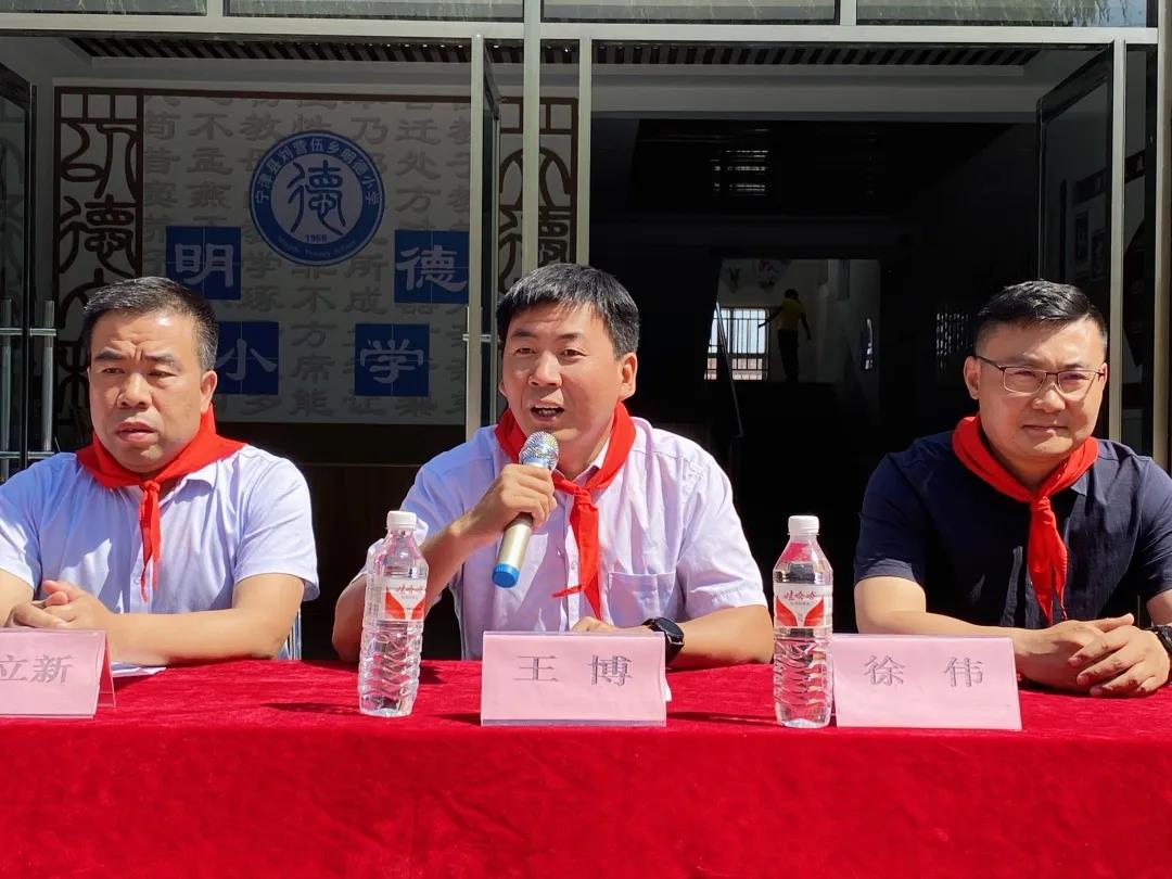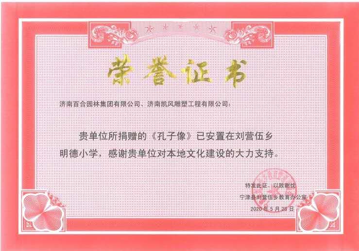 濟(jì)南百合園林集團(tuán)有限公司和濟(jì)南凱風(fēng)雕塑工程有限公司共同向劉營(yíng)伍鄉(xiāng)明德小學(xué)捐贈(zèng)孔子像。