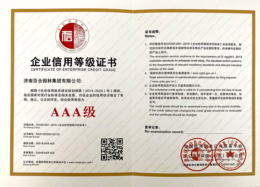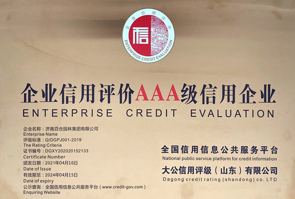 全國信用信息公共服務(wù)平臺和大公信用評級(山東)有限公司對百合園林集團(tuán)的信用狀況進(jìn)行了綜合評定,評價(jià)服務(wù)符合Q/DGPJ001-2019《企業(yè)信用等級評價(jià)標(biāo)準(zhǔn)》的各項(xiàng)要求,規(guī)定的內(nèi)容符合國家有關(guān)強(qiáng)制性標(biāo)準(zhǔn)及相關(guān)產(chǎn)業(yè)政策的要求,評定信用等級為AAA級。