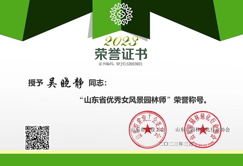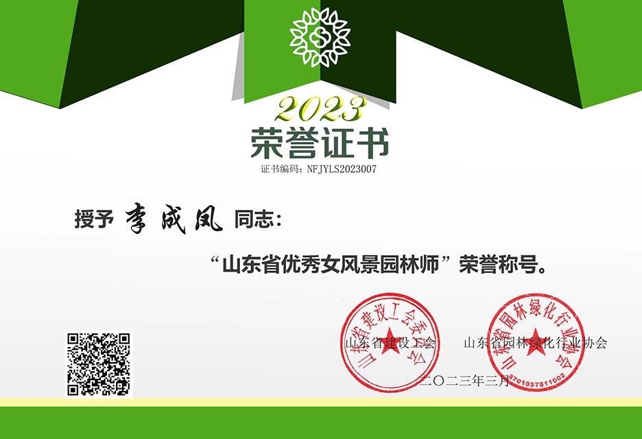 近日,由山東省建設(shè)工會和山東省園林綠化行業(yè)協(xié)會組織開展的山東省園林綠化行業(yè)第一屆“優(yōu)秀女風(fēng)景園林師”選樹結(jié)果揭曉,宣傳展示園林綠化行業(yè)女性從業(yè)者做出的突出貢獻(xiàn),百合園林集團(tuán)李成鳳、吳曉靜同志喜獲“山東省優(yōu)秀女風(fēng)景園林師”榮譽(yù)稱號。